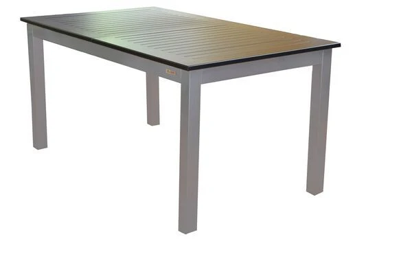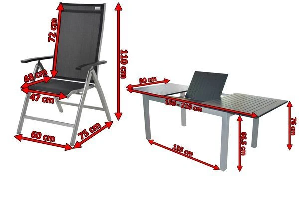 Die Esstischgruppe besteht aus einem Ausziehtisch und sechs Multipositionssesseln. Das Gestell vom Tisch, sowie die der Sessel wurden aus Aluminium mit einer silbernen Pulverbeschichtung angefertigt. Die Tischplatte wurde ebenfalls aus Aluminium mit einer schwarzen Pulverbeschichtung angefertigt. Aluminium eignet sich dank zahlreicher positiver Eigenschaften ideal für die Herstellung von Outdoor-Möbeln. Sie können die Esstischgruppe unbesorgt das ganze Jahr im Freien stehen lassen. Durch die Pulverbeschichtung wird das Material stoß-, schlag- und kratzfest. Die Sessel sind mit einer Bespannung aus Textilene in der Farbe schwarz ausgestattet. Das Kunststoffgewebe zeichnet sich durch eine hohe Belastbarkeit von bis zu ca. 100 kg aus. Zudem ist das Gewebe schnelltrocknend und pflegeleicht sowie frost- und hitzebeständig.