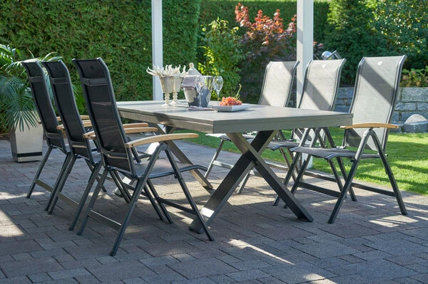 HARTMAN Sondermodell Xanadu / Alice Esstischgarnitur, xerix/schwarz, Alu/Glaskeramik, 4×4 Textilen, 6 Multipos, 220/280x100cm