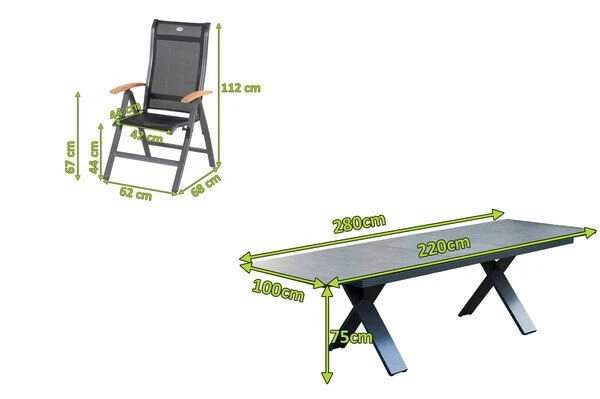 Mit den Multipositionssesseln aus der Alice Serie kommt die perfekte Kombination aus Stil und Komfort in den heimischen Garten – denn das Modell besticht nicht nur durch den robusten Aluminiumrahmen und die hochwertigen Armlehnen aus FSC®-Teakholz, sondern auch durch die justierbare Rückenlehne, die aufrecht wie zurückgelehnt herausragenden Komfort bietet. Mit Maßen von ca. 68 x 62 x 111,5 cm, einer Sitzhöhe von ca. 44 cm und einer Sitzfläche von ca. 42 x 44 cm passt er perfekt zum Tisch. Die Sessel sind in einem edlen xerix / schwarz gehalten, lediglich die Armlehnen aus FSC®-zertifiziertem Teak sind farblich hervorgehoben.