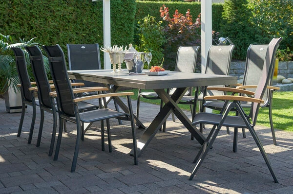 HARTMAN Sondermodell Xanadu / Alice Esstischgarnitur, xerix/schwarz, Alu/Glaskeramik, 4×4 Textilen, 6 Stapelsessel, 2 Multipos, 220/280x100cm