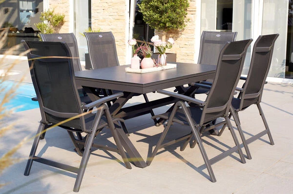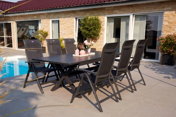 Hartman Esstischgarnitur mit Xanadu Ausziehtisch aus Alu und 6 Multipositionssessel aus der Serie „Alice“