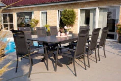Elegant und zugleich robust präsentiert sich diese extravagante Esstischgruppe von Hartman für 8 Personen. Das Set besteht aus einem rechteckigen Esstisch mit den Maßen von ca. 160/220 x 100 cm und 8 Stapelsessel aus der „Alice“-Serie.