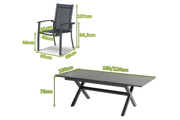 Das gekreuzte Gestell ist gefertigt aus pulverbeschichtetem Aluminium in der Farbe Xerix (Anthrazit) und wird optisch perfekt durch die Glaskeramik-Tischplatte, ebenfalls in der Farbe Xerix ergänzt. Die Maße von ca. 160 x 100 x 75 cm sorgen dafür, dass stets ausreichend Ablagefläche zur Verfügung steht. Bei Bedarf kann der Tisch auf eine Länge von ca. 220 cm ausgezogen werden, so finden bequem auch große Runden genügend Platz in Ihrem Garten. Dank der Ausziehfunktion hebt sich dieses Modell von den üblichen Tischen der Xanadu Serie ab – den Ausziehtisch erhalten Sie exklusiv bei uns.