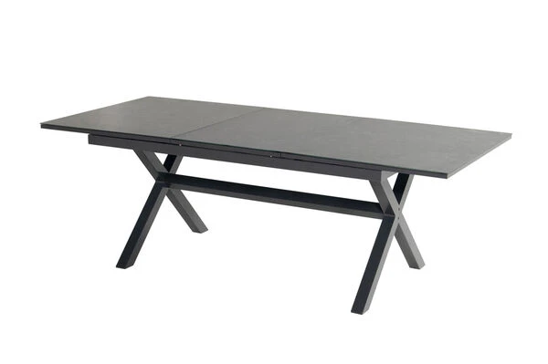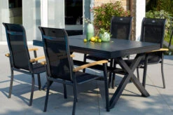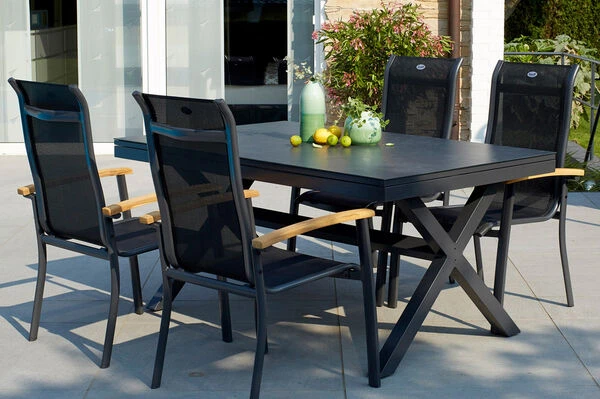 Das gekreuzte Gestell ist gefertigt aus pulverbeschichtetem Aluminium in der Farbe Xerix (Anthrazit) und wird optisch perfekt durch die Glaskeramik-Tischplatte, ebenfalls in der Farbe Xerix ergänzt. Die Maße von ca. 220 x 100 x 75 cm sorgen dafür, dass stets ausreichend Ablagefläche zur Verfügung steht. Bei Bedarf kann der Tisch auf eine Länge von ca. 280 cm ausgezogen werden, so finden bequem auch große Runden genügend Platz in Ihrem Garten. Dank der Ausziehfunktion hebt sich dieses Modell von den üblichen Tischen der Xanadu Serie ab – den Ausziehtisch erhalten Sie exklusiv bei uns. Die verwendeten Materialien sind extrem witterungsbeständig und pflegeleicht, weshalb der Tisch auch bei schlechtem Wetter ohne Probleme auf Ihrer Terrasse stehen bleiben kann. Außerdem ist das Aluminium ziemlich unempfindlich und hält spielend Kälte und Frost stand. Die Tischplatte aus dem Glas-Keramik-Gemisch ist stoß-, schlag- und schnittbeständig und somit ein idealer Begleiter im Familienalltag. Die Trägerplatte ist eine Platte aus Glas, auf die eine dünne Keramikschicht aufgetragen wird. Die Sessel von Hartman wissen durch die qualitativ hochwertige Verarbeitung und Stabilität zu überzeugen. Wegen der Armlehnen aus FSC-zertifiziertem Teakholz entsteht eine unverwechselbare Optik, die die Stühle zu einem echten Hingucker machen. Dank der vorteilhaften Stoffzusammensetzung der schwarzen Textilenbespannung aus 70% Polyvinylchlorid und 30% Polyester profitieren Sie von einer langen Haltbarkeit. Sie werden gar nicht mehr aufstehen wollen, denn das witterungsbeständige Material ist durch seine Flexibilität auch ohne Auflagen sehr bequem. Das Gestell aus robustem Aluminium sorgt für ein geringes Eigengewicht von nur ca. 5,3 kg, sodass sich die Stühle kinderleicht verschieben oder an die gewünschte Position tragen lassen. Trotz des leichten Gewichts sind die Sessel äußerst stabil und können mit bis zu 130 kg belastet werden. Um Ihren Terrassenboden beim Verschieben zu schützen, verfügen die Füße über praktische Bodenschoner. Ob Sie beim Essen ganz aufrecht sitzen möchten oder sich in der Sonne zurücklehnen wollen um zu entspannen, Sie finden immer die richtige Sitzposition. Ebenso schnell und unkompliziert können Sie die Stühle zusammenklappen und platzsparend verstauen.