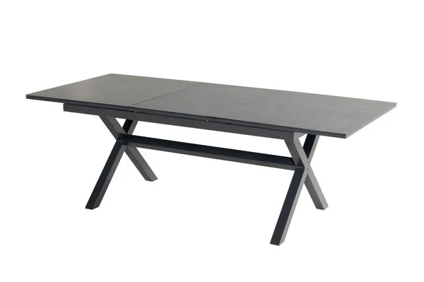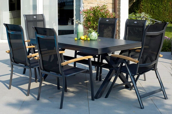 Das gekreuzte Gestell ist gefertigt aus pulverbeschichtetem Aluminium in der Farbe Xerix (Anthrazit) und wird optisch perfekt durch die Glaskeramik-Tischplatte, ebenfalls in der Farbe Xerix ergänzt. Die Maße von ca. 160 x 100 x 75 cm sorgen dafür, dass stets ausreichend Ablagefläche zur Verfügung steht. Bei Bedarf kann der Tisch auf eine Länge von ca. 220 cm ausgezogen werden, so finden bequem auch große Runden genügend Platz in Ihrem Garten. Dank der Ausziehfunktion hebt sich dieses Modell von den üblichen Tischen der Xanadu Serie ab – den Ausziehtisch erhalten Sie exklusiv bei uns.Die verwendeten Materialien sind extrem witterungsbeständig und pflegeleicht, weshalb der Tisch auch bei schlechtem Wetter ohne Probleme auf Ihrer Terrasse stehen bleiben kann. Außerdem ist das Aluminium ziemlich unempfindlich und hält spielend Kälte und Frost stand. Die Tischplatte aus dem Glas-Keramik-Gemisch ist stoß-, schlag- und schnittbeständig und somit ein idealer Begleiter im Familienalltag. Die Trägerplatte ist eine Platte aus Glas, auf die eine dünne Keramikschicht aufgetragen wird.Die Sessel aus der Alice-Serie von Hartman überzeugen durch die qualitative Verarbeitung und die Verwendung ausgesuchter Materialien. Die Armlehnen aus FSC-zertifiziertem Teakholz erzeugen eine unverwechselbare Optik und machen die Stühle zu einem einzigartigen Möbelstück. Das Gestell aus robustem Aluminium sorgt für ein geringes Eigengewicht von ca. 4,3 kg den Multipositionssesseln, sowie 5,3 kg bei einer hohen Stabilität, sodass die Sessel mit bis zu 130 kg belastbar sind. Um Ihren Terassenboden vor Kratzern und Macken zu schützen, verfügen die Füße über praktische Bodenschoner. Dank der vorteilhaften Stoffzusammensetzung der 4×4 Textilenbespannung aus 70% Polyvinylchlorid und 30% Polyester profitieren Sie von einer langen Haltbarkeit. Das flexible Material trotzt spielend den üblichen Witterungseinflüssen, passt sich optimal Ihrem Körper an und macht die Modelreihe auch ohne Auflage sehr bequem.