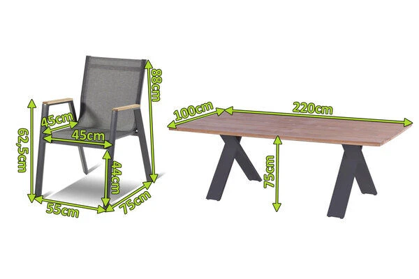 Der Tisch mit dem gekreuzten Gestell ist gefertigt aus pulverbeschichtetem Aluminium in der Farbe Xerix (Anthrazit) und wird optisch perfekt durch die Tischplatte aus SVLK-zertifiziertem Teakholz ergänzt. Die Maße von ca. 220 x 100 x 75 cm sorgen dafür, dass stets ausreichend Ablagefläche zur Verfügung steht und bequem 8 Personen genügend Platz finden.