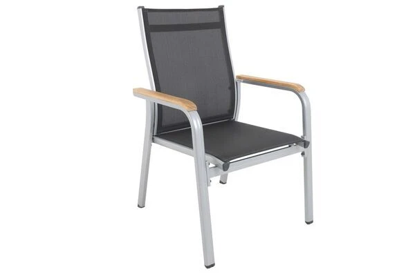 Die Stapelsessel bestechen durch ihre schlichte Optik mit dem pulverbeschichteten Aluminiumrahmen in einem schönen Silber in Kombination mit dem anthrazitfarbenen Textilen-Gewebe. Ergänzt wird dieses zeitlose Design durch FSC-zertifizierte Teakholz-Armlehnen. Dank des pulverbeschichteten Aluminiumgestells sind die Sessel leicht und einfach zu transportieren. Je nach Bedarf können Sie die Sessel ineinander stapeln und somit platzsparend verstauen.