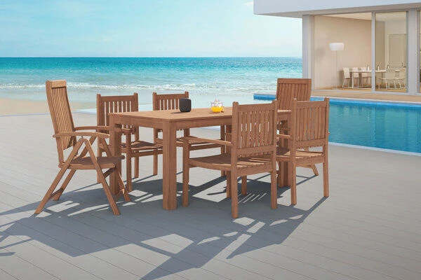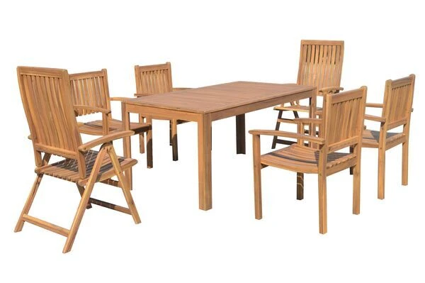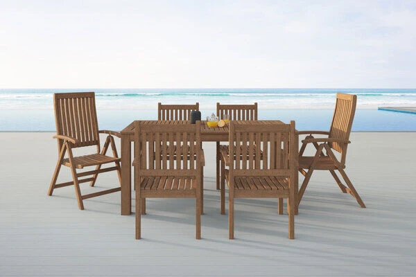 Das 7-teilige Set von OUTFLEXX® begeistert alle Holzliebhaber durch seine Robustheit, seinen Komfort und seinen natürlichen Look unter freiem Himmel. Die Esstischgruppe bietet Platz für bis zu 6 Personen und beinhaltet vier Gartenstühle und zwei Klappsessel mit Armlehnen und einen großen, rechteckigen Tisch.