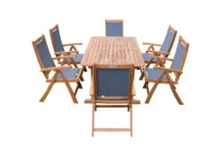Die hochwertigen Materialien prägen nicht nur das zeitgemäße Design, sie machen die Esstischgarnitur auch pflegeleicht und witterungsbeständig. Die Aluminium-Gestelle sind gegen jegliche Umwelteinflüsse gefeit und ihre Pulverbeschichtung verleiht ihnen zudem Stoß-, Schlag- und Kratzfestigkeit. Die Tischplatte aus HPL ist licht- und witterungsbeständig, kratzfest und dazu leicht zu reinigen ist. Die Bespannung der Sessel (Textilene) besteht aus 100 % Polyester, ist besonders UV-beständig, reißfest und verliert nie ihre Form. Das Material trocknet zudem sehr schnell, weshalb auch Regenschauer Ihr Gartenvergnügen nur kurz unterbrechen. Das FSC®-zertifizierte Teakholz ist ebenfalls witterungsbeständig und hält sowohl Hitze und Frost, als auch Regen und Feuchtigkeit aus. Es hat außerdem einen natürlichen Schutz gegen Pilze und andere Schädlinge, sodass sich die Pflege auf ein Minimum beschränkt. Mit etwas Wasser lassen sich auch oberflächliche Verschmutzungen direkt entfernen und es bleibt Ihnen mehr Zeit für Entspannung. Zusätzliche Fußkappen bieten Schutz für die Gestelle und Ihre Terrasse. So haben Sie sorgenfrei über viele Jahre Freude an Ihrem Dining-Bereich.