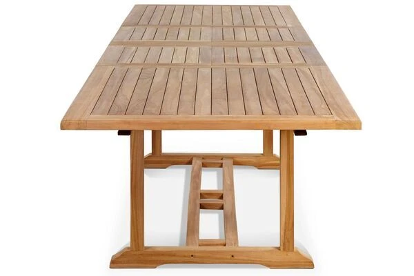 Der Tisch benötigt nicht viel Schnickschnack um selbst den anspruchsvollsten Gartenliebhaber zu überzeugen. Das schlichte Design in Kombination mit dem natürlichen Material, verleiht dem Tisch sein besonderes Aussehen und sorgt dafür, dass er sich zu nahezu jeder Garteneinrichtung harmonisch kombinieren lässt. Die rechteckige Tischform und die ca. 3 cm dicke Teakholz-Tischplatte machen den Tisch so besonders. Mit seiner Größe von ca. 195/295 x 90 x 75 cm bietet er ausreichend Platz für 8-10 Personen. Die Tischplatte können Sie ganz einfach auf eine Länge von ca. 295 cm ausziehen. Dazu schieben Sie die Tischplatte an beiden Seiten nach außen. In der Mitte können Sie nun das Verlängerungsstück ausklappen und die beiden äußeren Seiten wieder anschieben – perfekt wenn sich spontaner Besuch ankündigt.