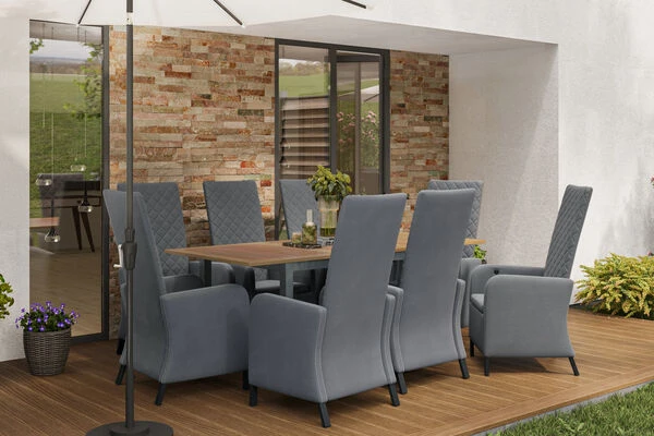 Sie verbringen gerne gemütliche Grillabende mit Ihren Liebsten und sind auf der Suche nach einer bequemen und zugleich pflegeleichten Esstischgarnitur? Dann sollten Sie sich diese Esstischgruppe bestehend aus einem praktischen Ausziehtisch und 8 extravaganten Sunbrella Sesseln von OUTFLEXX® genauer ansehen.
