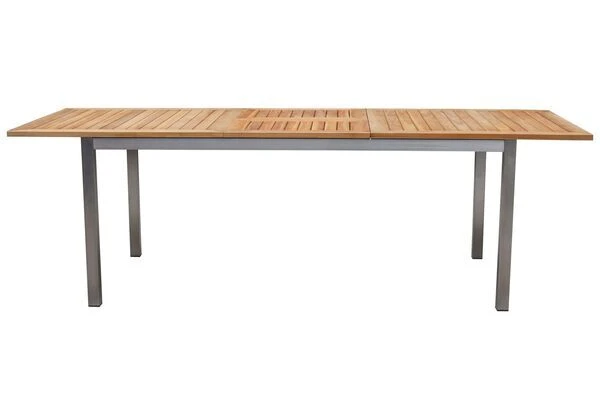 Der Tisch lässt sich dank eines ausgeklügelten Schienensystems kinderleicht ausziehen und bietet auf maximal ca. 240 cm Länge bequem für bis zu 8 Personen Platz. Die Tischplatte besteht aus ca. 2,5 cm starken Bohlen aus massivem Teakholz. Das Gestell aus hochwertigem 304er-Edelstahl gibt dem Tisch mit seinen ca. 5 x 5 cm starken Tischbeinen eine besonders hohe Stabilität. Damit Ihr Boden vor Kratzern geschützt ist, wurden die Tischbeine mit Kunststoffkappen bestückt. Die hochwertige Materialauswahl und die sorgfältige Verarbeitung sorgen nicht nur für die exklusive Optik dieses Ausziehtisches, sondern machen ihn mit einer Belastbarkeit von ca. 150 kg auch sehr stabil.