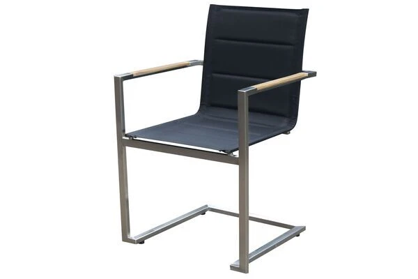 Die zeitlosen Stühle besitzen eine Bespannung aus hochwertigem Textilen in der Farbe schwarz, hergestellt aus 75% Polyvinylchlorid und 25% Polyester. Das witterungsbeständige Material ist durch seine Flexibilität und seine zusätzliche Polsterung (padded) auch ohne Auflagen sehr bequem. Das formstabile Gewebe nimmt kein Wasser auf, ist atmungsaktiv und trocknet nach einem kurzen Schauer sehr schnell. Das sorgfältig verarbeitete Gestell aus rostfreiem 304er Edelstahl passt ideal zu den übrigen verwendeten Materialien, sodass ein harmonisches und elegantes Gesamtbild entsteht. Die hochwertigen Materialien und die sorgfältige Verarbeitung sorgen nicht nur für die besondere Optik dieser Stühle, sondern machen sie mit einer Belastbarkeit von ca. 150 kg sehr stabil.