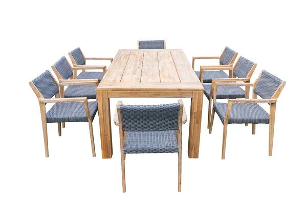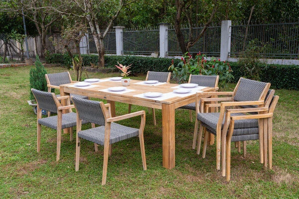Die Esstischgarnitur besteht aus einem Esstisch mit den Maßen von ca. 200x 100 x 77 cm sowie sechs Stapelstühlen. Der Akazienholztisch bietet mit seiner ca. 220 x 100 cm großen Tischplatte genügend Platz für acht Personen. Der Esstisch wurde aus geöltem FSC-zertifizierten Akazienholz gefertigt, wodurch sie ideale, wetterfeste Materialeigenschaften aufweist.