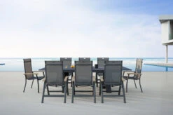 Diese gemütliche Esstischgruppe bietet bequem bis zu 6 Personen Platz. Das Set besteht aus einem Auszugs-Dining-Tisch und sechs Diningsesseln. Hier können Sie bequem Ihr Mittag- oder Abendessen zu sich nehmen – und danach mit einem guten Buch in der Sonne entspannen. Hierzu brauchen Sie einfach nur Platz zu nehmen und eine bequeme Sitzposition einstellen. Dies gelingt kinderleicht dank der integrierten Gasdruckfeder – die Rückenlehne kann mit einem kleinen Knopf an der Seite stufenlos verstellt werden.