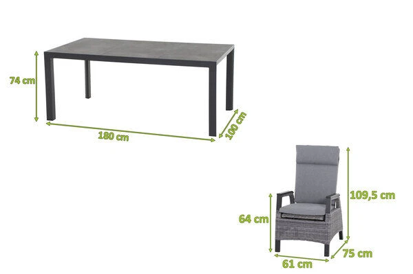 Wer das Besondere liebt ist mit diesem Esstisch bestens bedient. Der Tisch bietet mit seinen Maßen von ca. 180 x 100 x 74 cm Platz für ca. 6 Personen – so steht dem gemütlichen Mittagessen mit der Familie nichts mehr im Wege. Das Gestell wurde aus pulverbeschichtetem Aluminium in matt anthrazit hergestellt, was den Tisch besonders haltbar macht. Die Tischplatte besteht aus hochwertigem Keramik, während die Tischbeine für ein weiteres optisches Highlight sorgen. Durch die großzügige Unterschubhöhe kann man gemütlich mit vielen Arten von Sesseln an diesem Tisch Platz nehmen. Der Tisch hat ein Gewicht von ca. 59 kg, und ist somit perfekt gegen Windstöße geschützt. Die Fußkappen bestehen aus schwarzem Kunststoff und schützen den Boden vor unschönen Kratzern beim Verrücken des Möbelstücks.