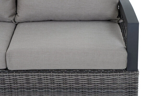 Die verwendeten Materialien sorgen bei Wind und Wetter für den nötigen Schutz. Das Untergestell des 2-Sitzers besteht aus pulverbeschichtetem Aluminium in matt-anthrazit und macht das Loungesofa nicht nur stabil, sondern sorgt auch dafür, dass es sich aufgrund des relativ geringen Gewichts (ca. 18,4 kg) ganz leicht hin und her stellen lässt. Das Aluminiumgestell wird mit halbrundem GARDINO®-Geflecht aus Polyethylen bespannt. Diese Faser trocknet besonders schnell, ist schmutzunempfindlich und erzeugt mit ihrer natürlichen Optik in „charcoal grey“ einen edlen und modernen Look, der jeder Gartengestaltung ein besonderes Flair verleiht. Die gemütlichen und pflegeleichten Sitzpolster aus 100 % Polypropylen (280 g/m²), sind farblich passend auf das Geflecht abgestimmt. Bei Verschmutzung können Sie die Bezüge abnehmen und von Hand waschen. Ergänzen Sie das tolle Loungesofa mit den weiteren Möbeln der Serie Corido von SIENA GARDEN. Die große Auswahl macht es Ihnen leicht sich Ihren persönlichen Ruhepol zusammenzustellen. Sie werden sehen, Ihre Wellnessoase zum Durchatmen und Entspannen wird auch die Augen Ihrer Lieben zum Strahlen bringen.
