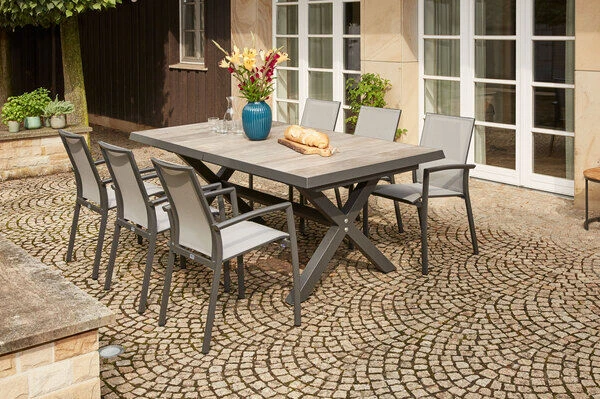 Jeder Sessel hat ein Gesamtmaß von ca. 56 x 66 x 89 cm und die Sitzhöhe liegt bei ca. 46 cm. Mit einem Gewicht von jeweils ca. 3,3 kg lassen sich die Sitzmöbel bei Bedarf auch schnell umplatzieren. Die praktischen ca. 64 cm hohen Armlehnen aus Aluminium erhöhen den Komfort. Der stylische Ausziehtisch Sincro hat eine Größe von ca. 204 x 103 x 77 cm und die Unterschubhöhe beträgt ca. 68 cm. Dank einem Gewicht von ca. 93,5 kg hält er auch jeglichen Windstößen perfekt stand. Sein ausgefallenes X-Gestell aus Aluminium ist ein wahrer Hingucker. Die moderne Keramik-Tischplatte in naturgrauer Holzoptik unterstreicht den natürlichen Look und verleiht dem Tisch einen edlen Charakter. Die Platte ist robust, pflegeleicht und dazu noch wetterfest – ideal für die Nutzung im Außen- und Innenbereich. Der Clou: bei spontanen Gästen müssen Sie nicht verzagen. Der Tisch lässt sich ganz einfach bis auf ca. 264 cm Länge ausziehen und bietet so selbst für eine große Runde ausreichend Platz. An diesem Tisch kommt man gerne zusammen!