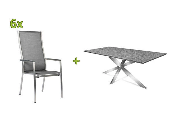 Ob fürs gemütliche Essen mit der Familie oder für eine elegante Dinner-Party, diese zeitlose Esstischgarnitur schenkt Ihnen immer das passende Ambiente. Sie erhalten einen ausdrucksstarken Esstisch aus Edelstahl und Granit und 6 dazu passende Stapelsessel der Serie Cardiff von STERN, die für den passenden Sitzgenuss sorgen. So verwandeln Sie Ihre Terrasse in einen charmanten Diningbereich unter freiem Himmel. Hier fühlt sich jeder Gast sofort willkommen!