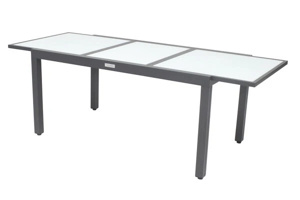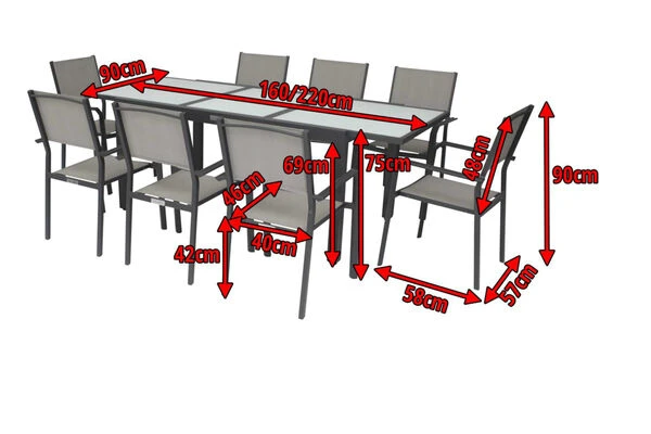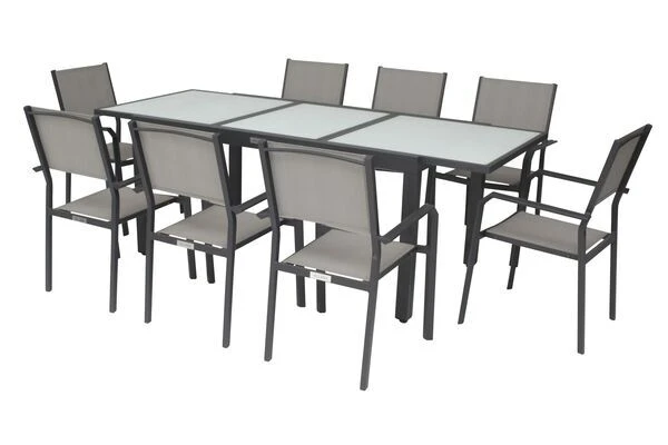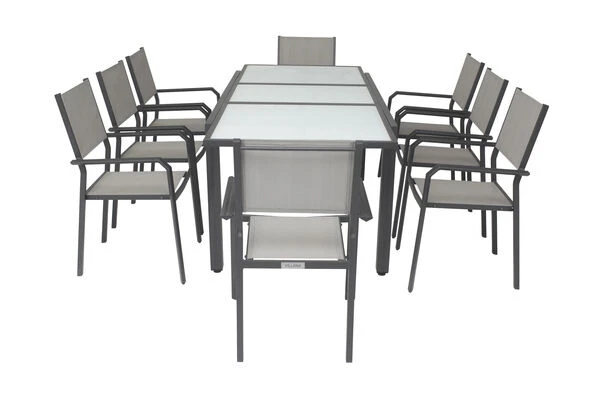 Diese Villana Esstischgruppe bietet Platz für acht Personen – perfekt, um mit Freunden, Familie oder Nachbarn gemütlich im Garten oder auf der Terrasse zu sitzen. Die Gruppe setzt sich aus einem ausziehbaren Gartentisch und acht Stapelstühlen zusammen, auf Wunsch können Sie diese Gruppe auch noch mit passenden Artikeln der Villana Serie erweitern. Der Tisch ist ca. 90 cm breit und ca. 75 cm hoch, im normalen Zustand hat er eine Länge von ca. 160 cm, so sind Sie sowohl für ein gemütliches Mittagessen mit der Familie als auch für die große Gartenparty bestens ausgerüstet. Das pulverbeschichtete Aluminiumgestell des Tisches kommt in einem attraktiven Anthrazit daher, die ca. 5 mm dicke Tischplatte aus Sicherheitsglas ist weiß. Die Platte zum Erweitern des Tisches ist ebenfalls aus ca. 5 mm dickem Sicherheitsglas gefertigt und lässt sich durch einen Flügelmechanismus ausklappen. Man zieht einfach die beiden oberen Platten auseinander und klappt die darunterliegende Platte nach oben, und schon ist der Tisch auf ca. 220 cm erweitert. Der Stapelstuhl verfügt ebenfalls über ein anthrazitfarben pulverbeschichtetes Aluminiumgestell, auf welches ein formstabiles Textil-Gewebe 2×1 (70% Polyvinylchlorid / 30% Polyester) in Grau aufgespannt wurde. Mit Maßen von ca. 58 x 57 x 90 cm und einem Gewicht von nur ca. 2,9 kg lässt sich der Stuhl ganz leicht hin und her stellen. Gleichzeitig bietet er die nötige Stabilität und dank der geteilten Sitz- und Rückenfläche einen angenehmen Sitzkomfort. Mit einer Belastbarkeit von bis zu ca. 160 kg ist der praktische Sessel besonders robust und für erholsame Stunden in der Sonne einsatzbereit. Bei Nichtgebrauch lassen sich die Stühle beispielsweise in einem Gartenschuppen oder an einem anderen Ort gestapelt einlagern und nehmen so sehr wenig Platz ein. Die Fußkappen der Möbel sind aus schwarzem Kunststoff und schützen den Boden vor unschönen Kratzern beim Verrücken des Stuhles, die silbernen Schrauben aus galvanisiertem Stahl runden die Optik perfekt ab.